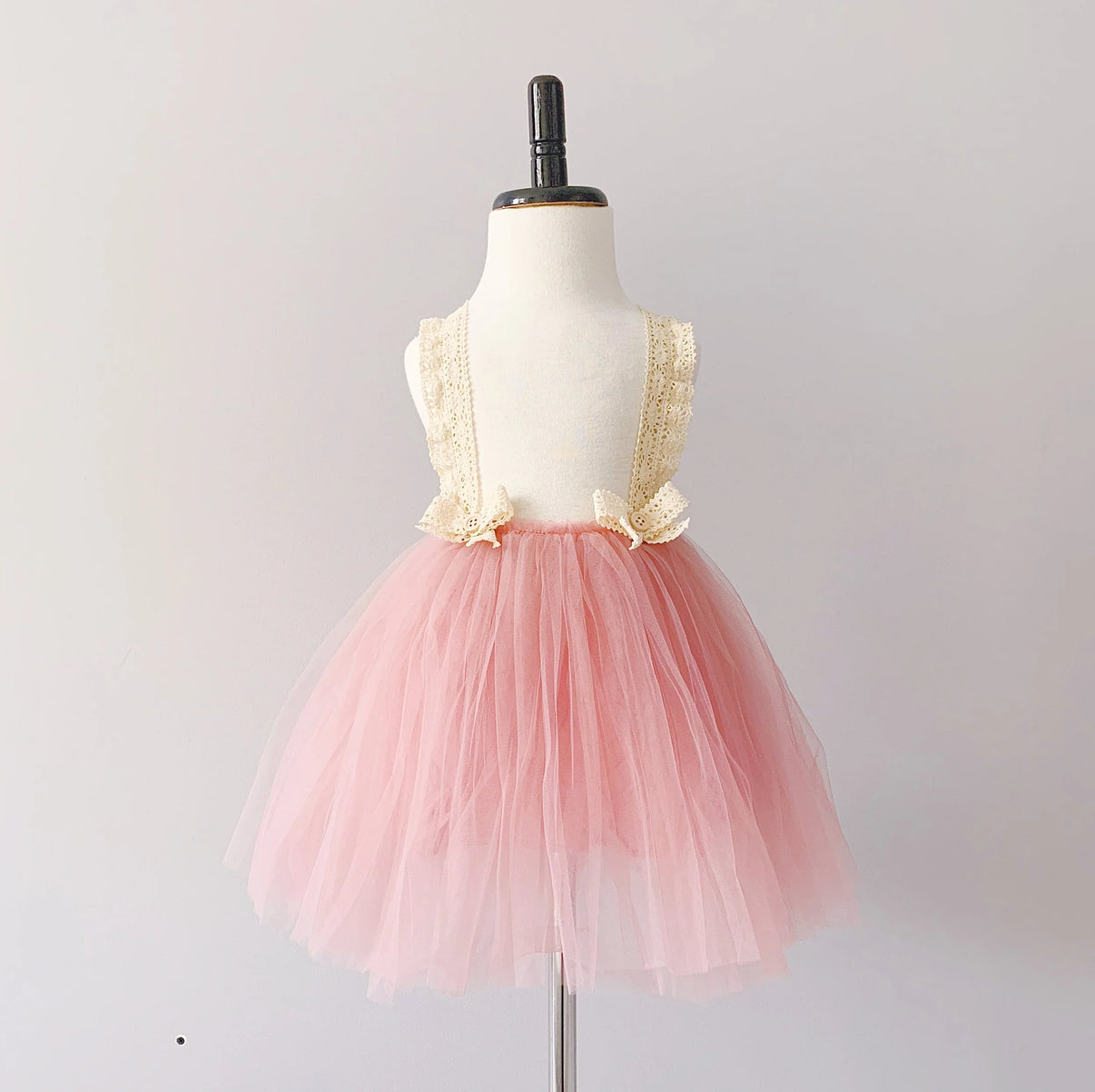 + 3 layers of silky soft tulle with a pair of butterfly straps and bows made with cotton embroidered lace and small wooden buttons stitched on the front. The straps can be attached or removed with snap buttons that are concealed on the inside of the skirt.