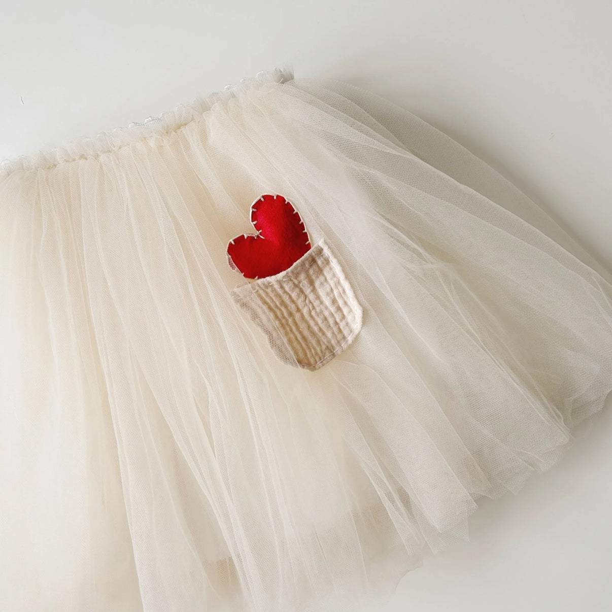 • 3 layers of silky soft tulle decorated with a gauze pocket and a removable plush, embroidered heart