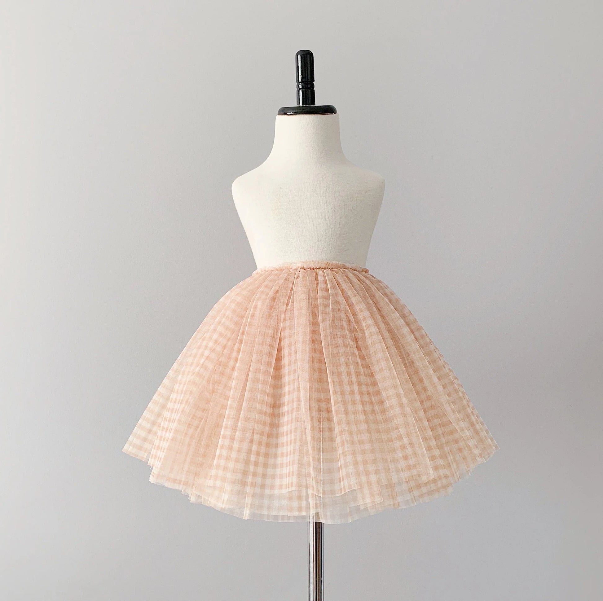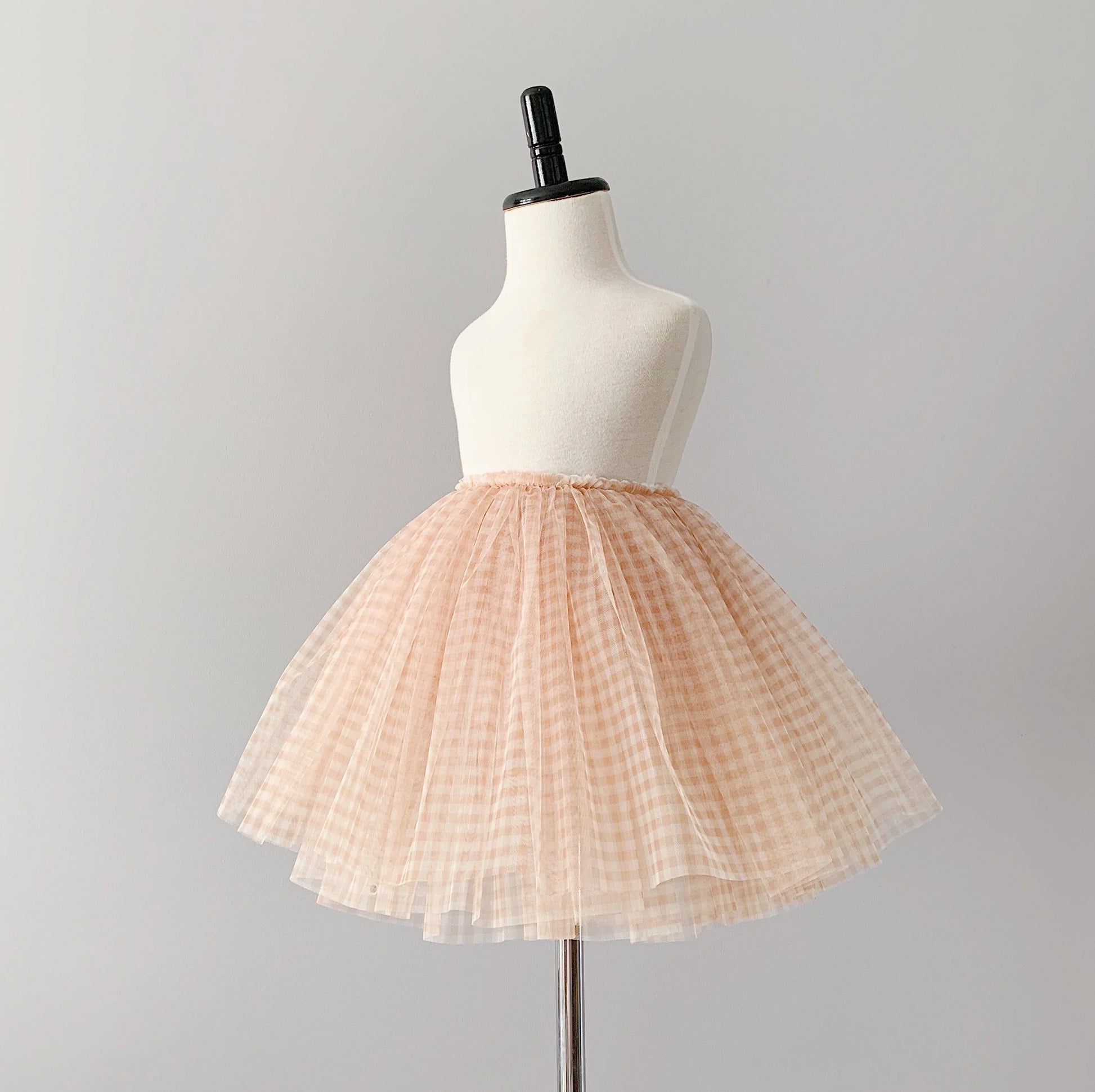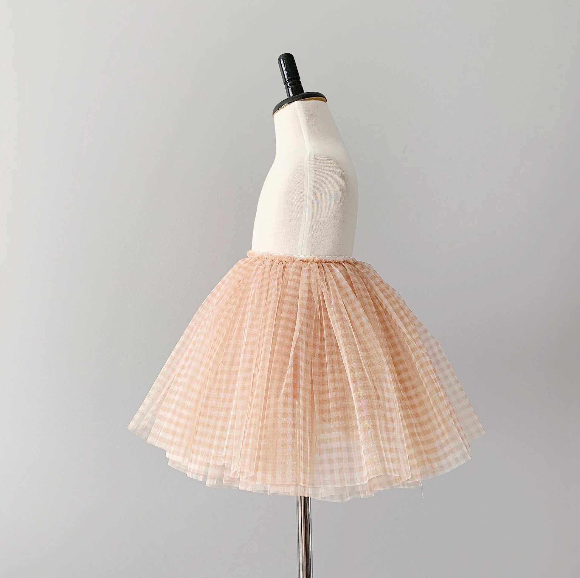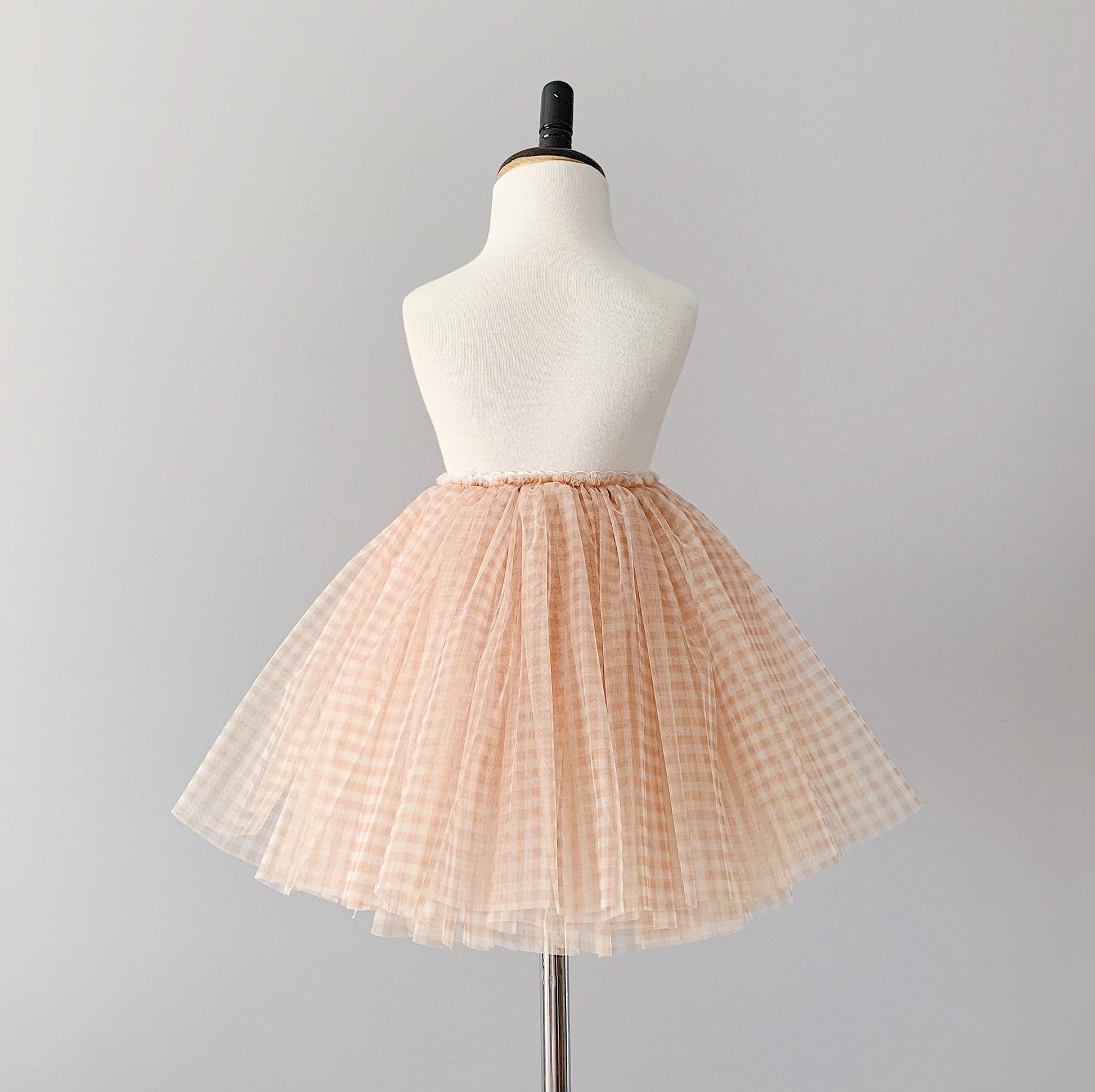 + 3 layers of wispy soft tulle with a printed gingham pattern