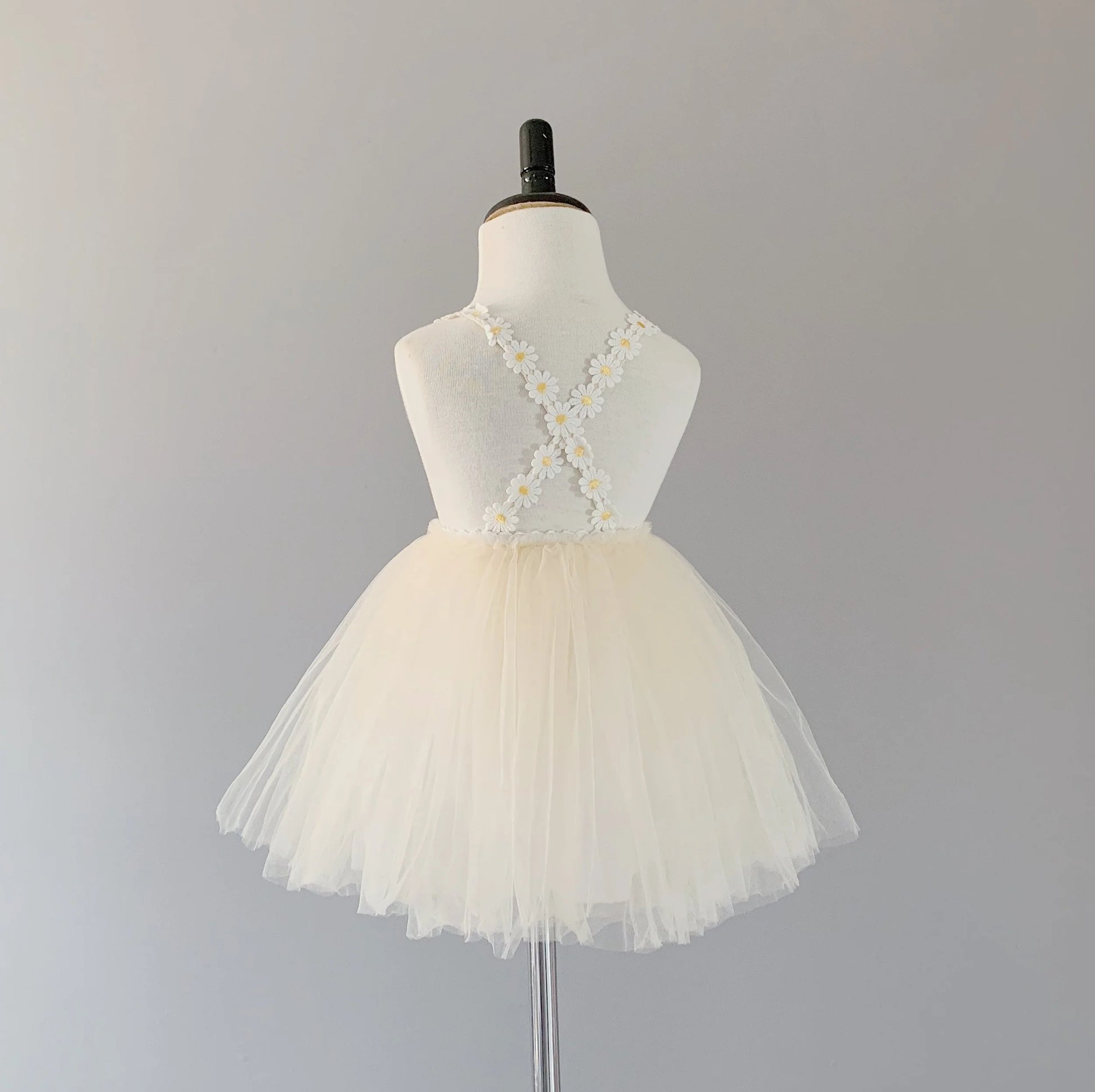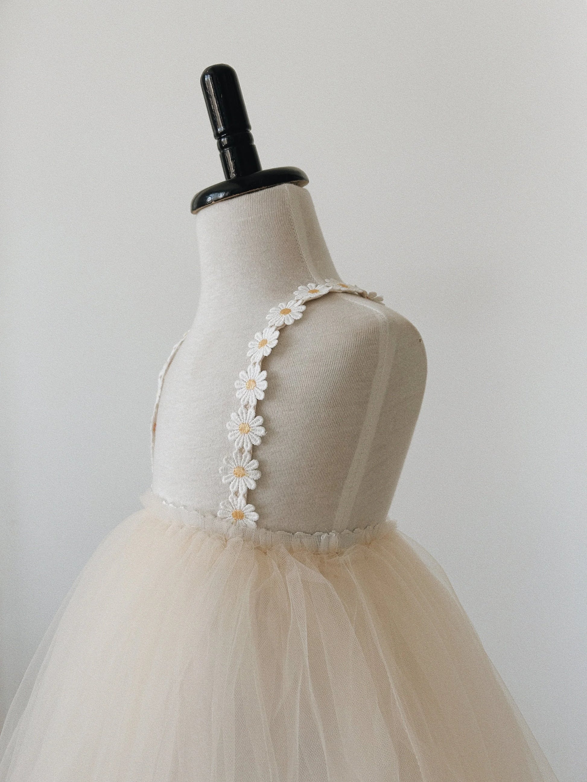 + 3 layers of silky soft tulle. Cotton straps are detachable and decorated with embroidered daisies.